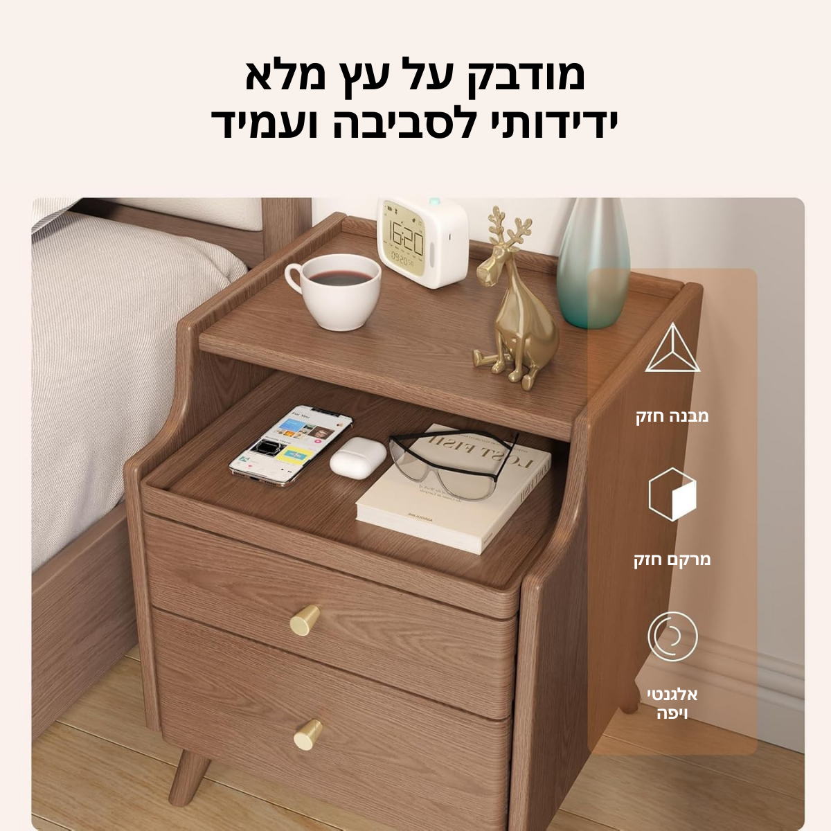 שידת הלילה מעץ מלא משלבת עמידות גבוהה עם עיצוב חמים ומודרני, ויוצרת אווירה נעימה ומסודרת לצד המיטה שלכם.